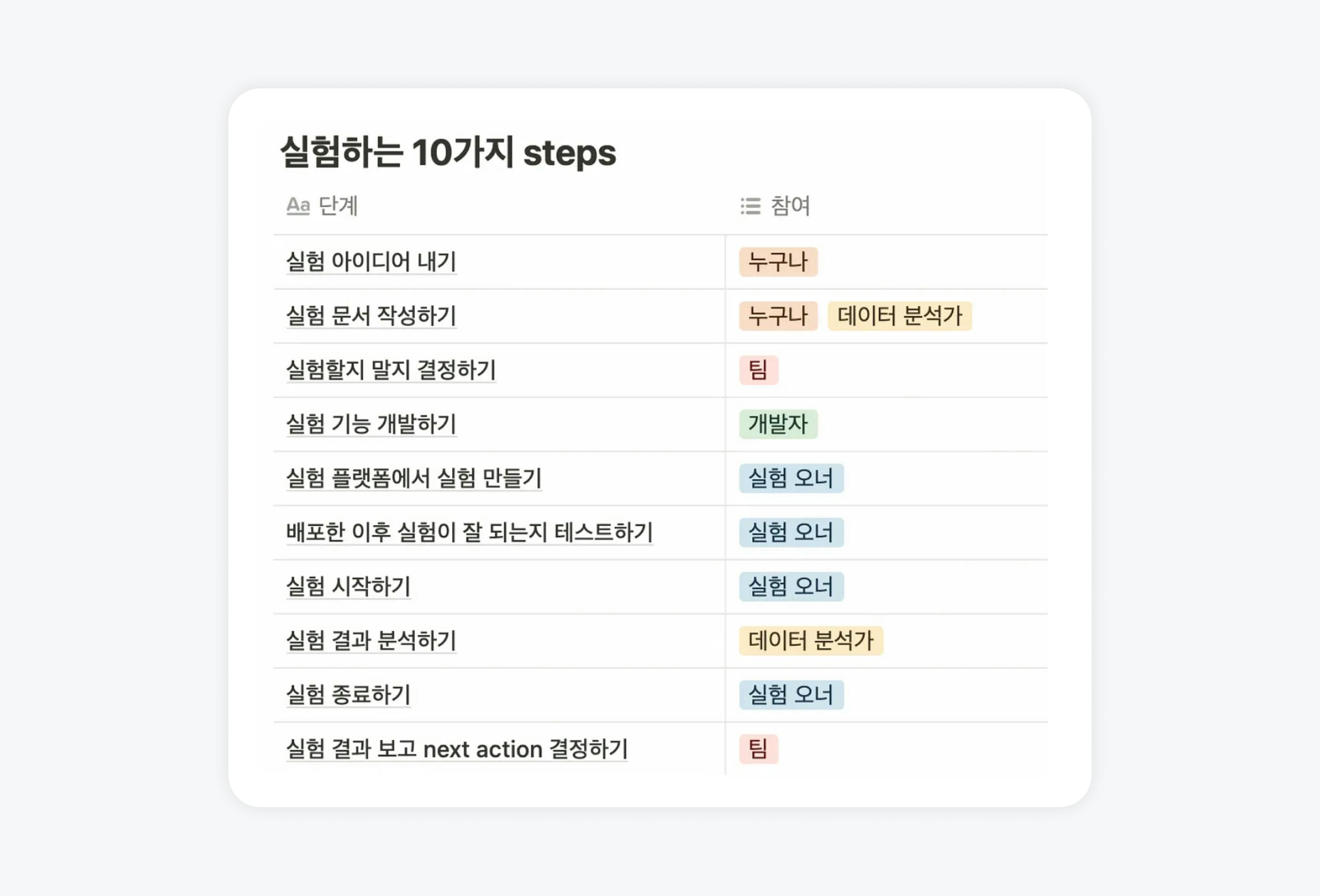 중고거래팀이 현재 어떻게 실험을 돌리는지 소개해볼게요. 최근에 팀에 공유했던 중고거래팀에서 실험을 하는 과정이에요. 총 10가지 step으로 나눠볼 수 있었어요.