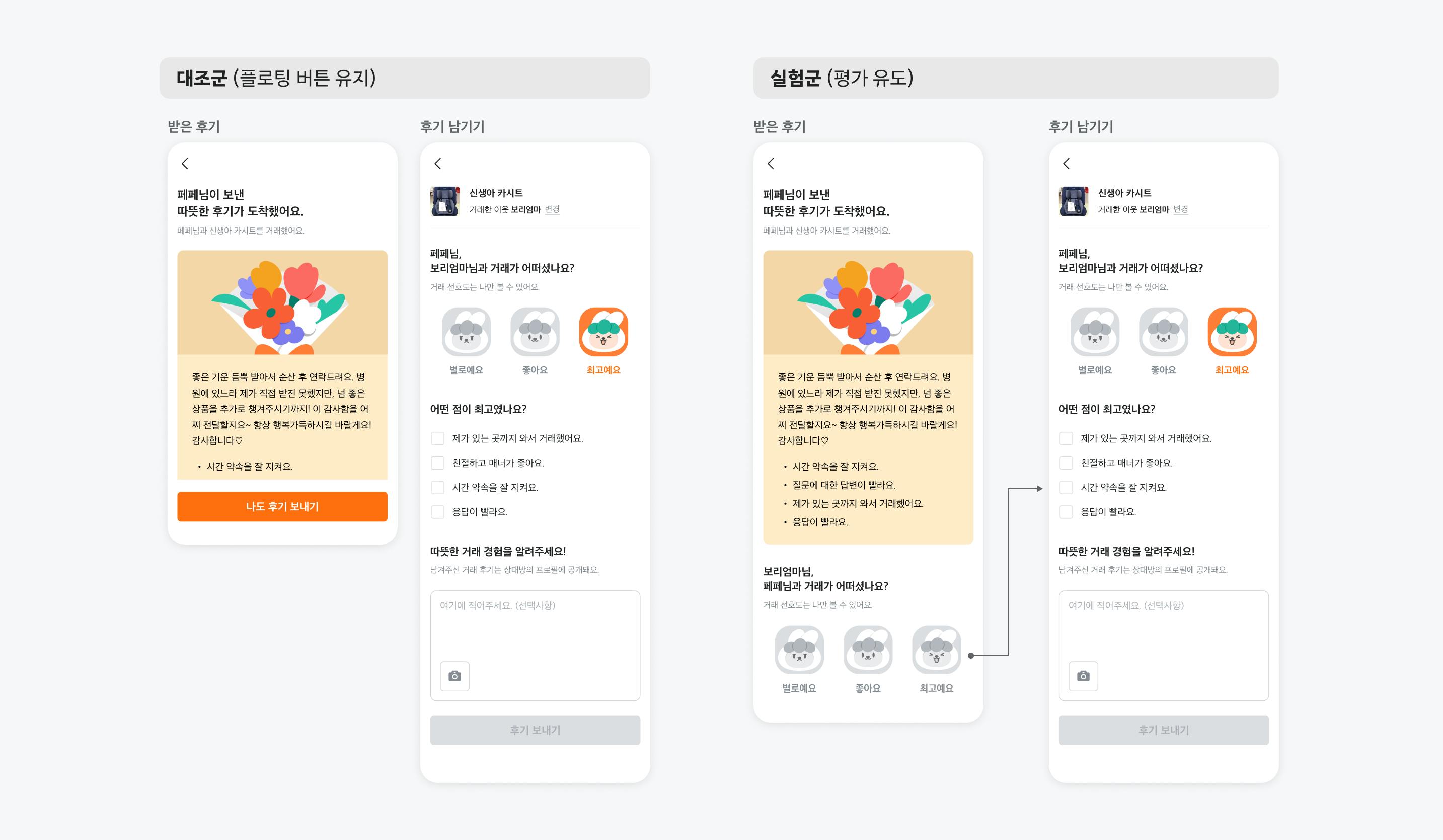 예를 들어 설명해보자면, 최근에 중고거래팀에서 거래후기와 관련한 A/B 테스트를 진행했어요. 당근마켓에서는 거래를 하고 나면 후기를 남길 수 있는데요. 이때, 상대방이 후기 를 작성하면 푸시 알림을 통해 상대방의 후기를 볼 수 있어요. 더 따뜻한 당근마켓이 되기 위해 후기를 받은 사용자도 후기를 남기도록 유도하면 좋다고 생각했고, 실험을 진행했어요.