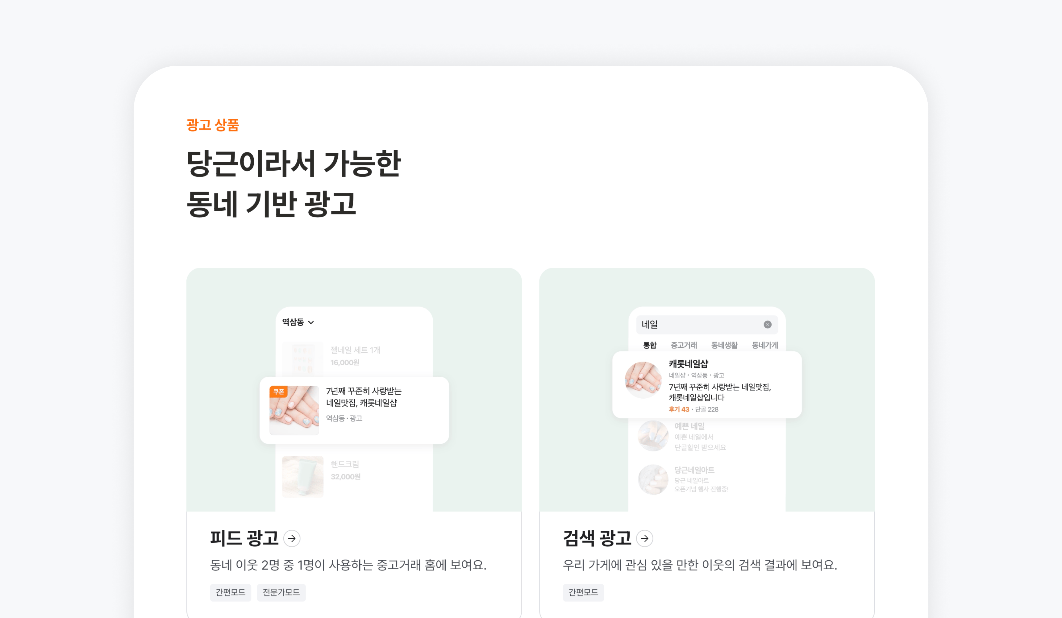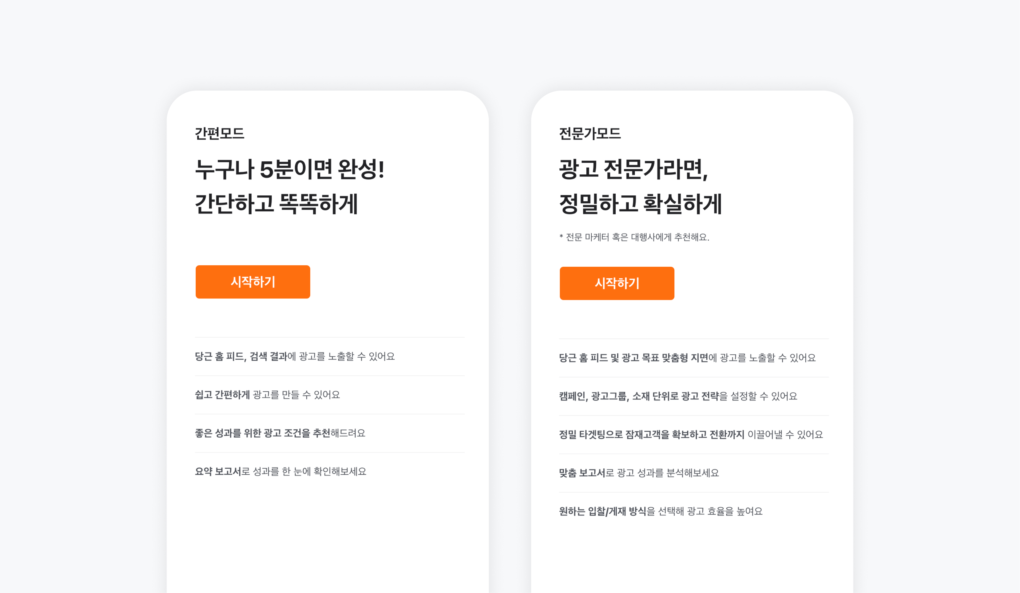 이러한 과정은 광고주가 광고에 얼마나 익숙한지에 따라 난이도가 다릅니다. 따라서 당근의 DSP는 지면구매 전략을 세세하게 설정할 수 있는 전문가모드와 일부 선택지를 제외한 나머지를 최적화해 알아서 처리해주는 간편모드를 제공하고 있는데요. 각각의 서비스를 제공하기 위해, 당근의 광고실이 어떤 고민을 하고 있는지 조금 더 구체적으로 이야기해 보려 합니다.