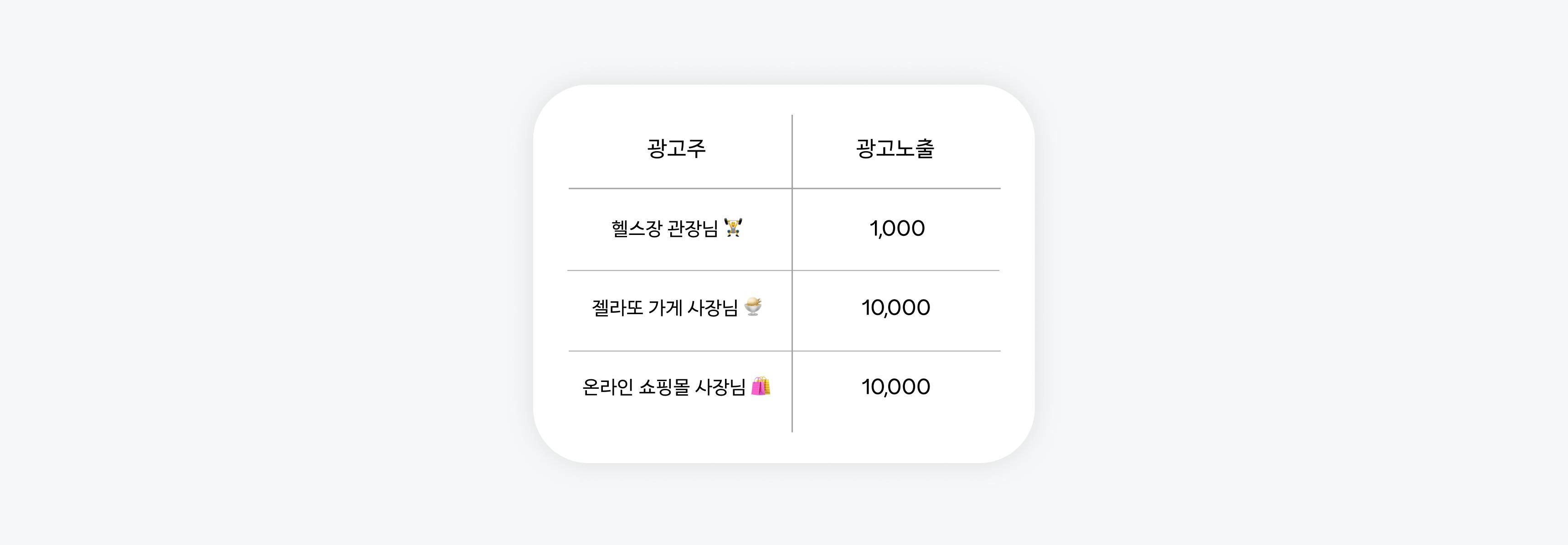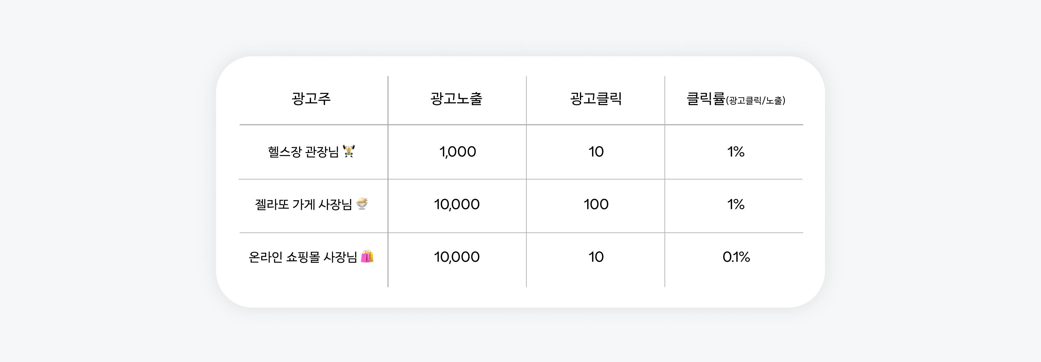 먼저 노출은 사용자들에게 광고가 몇 번 보였는지를 의미합니다. 광고 노출은 타겟 크기에 비례해 늘어나기 때문에 일반적으로 광고 노출이 광고 효과를 대변하지는 않습니다. 헬스장 관장님의 광고가 다른 사장님들의 광고보다 적게 노출되었다고 하더라도 같은 동네 사람들에게만 광고한 관장님의 광고가 지출대비 수익이 높을 수 있습니다.