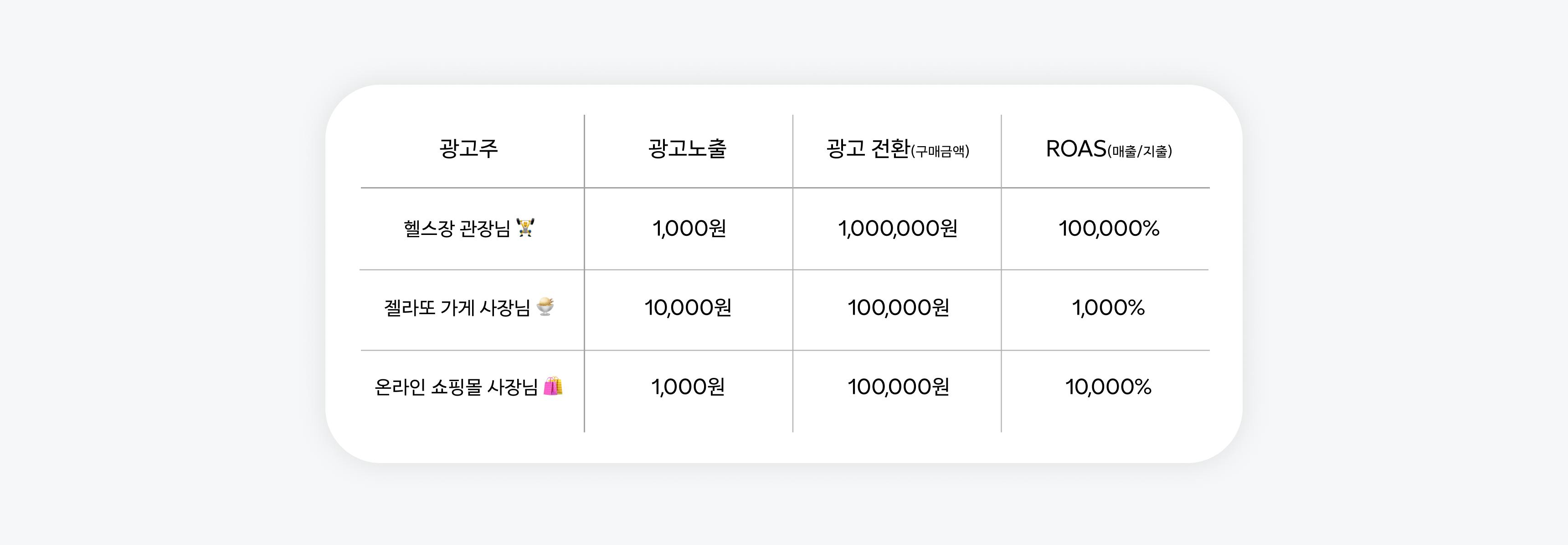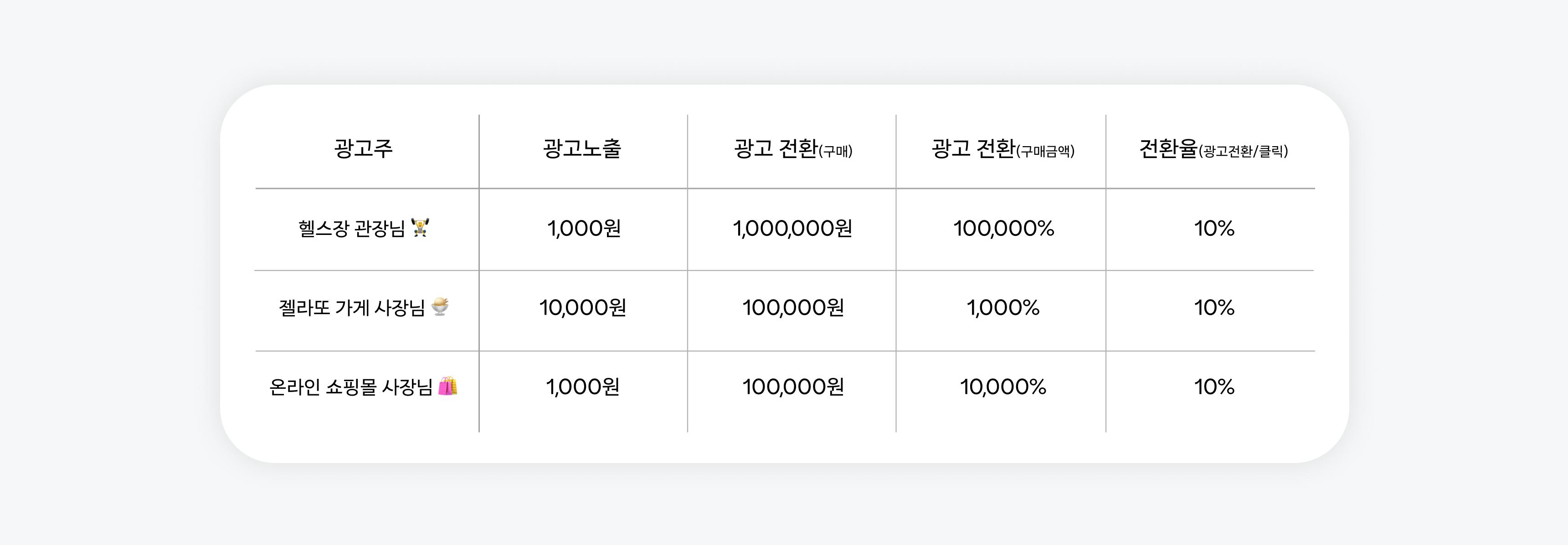 목적에 맞는 타겟층과 디자인으로 광고를 집행한 이후에는 광고 성과를 확인해야 합니다. DSP를 통해 확인할 수 있는 광고 성과로는 노출, 클릭, 전환이 있는데요. 뒤로 갈수록 광고주 체감효과가 큰 요소입니다. 예시의 광고를 통해 각 광고주가 얻은 성과와 광고비, 그로 인한 매출을 살펴보며 광고효과를 확인해 보겠습니다.