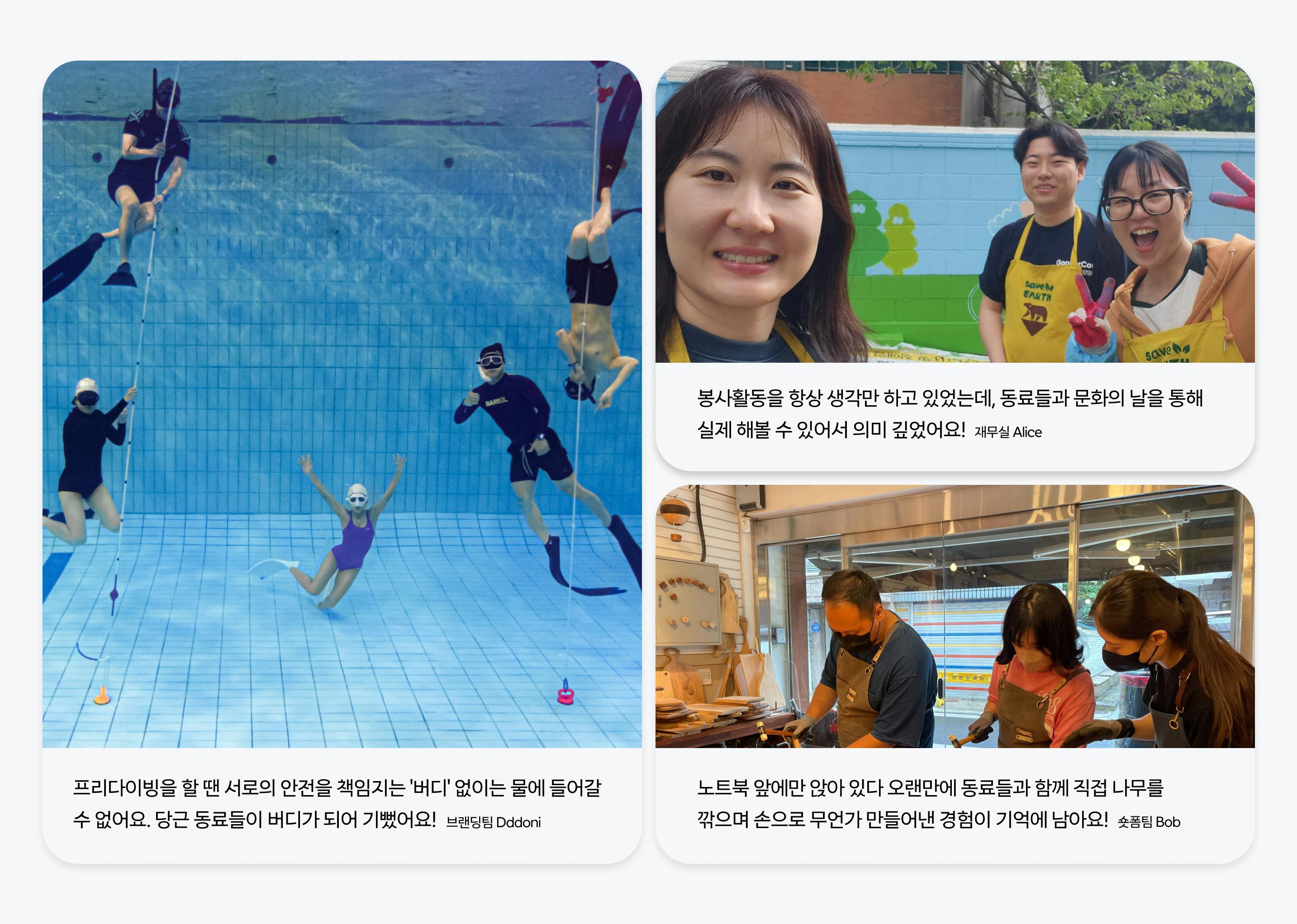 또 하나는 새로 온 사람들을 위한 협업의 윤활유 역할이에요. 회사가 빠르게 커지면서 다른 팀에 아는 사람이 한 명도 없는 경우가 생겼어요. 이럴 때 문화활동에서 안면을 튼 동료가 있다면 조금 더 심리적 안정감을 토대로 일할 수 있으리라 기대해요. 우리가 건강하게 오래 함께 하기 위한 긴장 완화의 역할을 문화활동이 해주고 있어요.