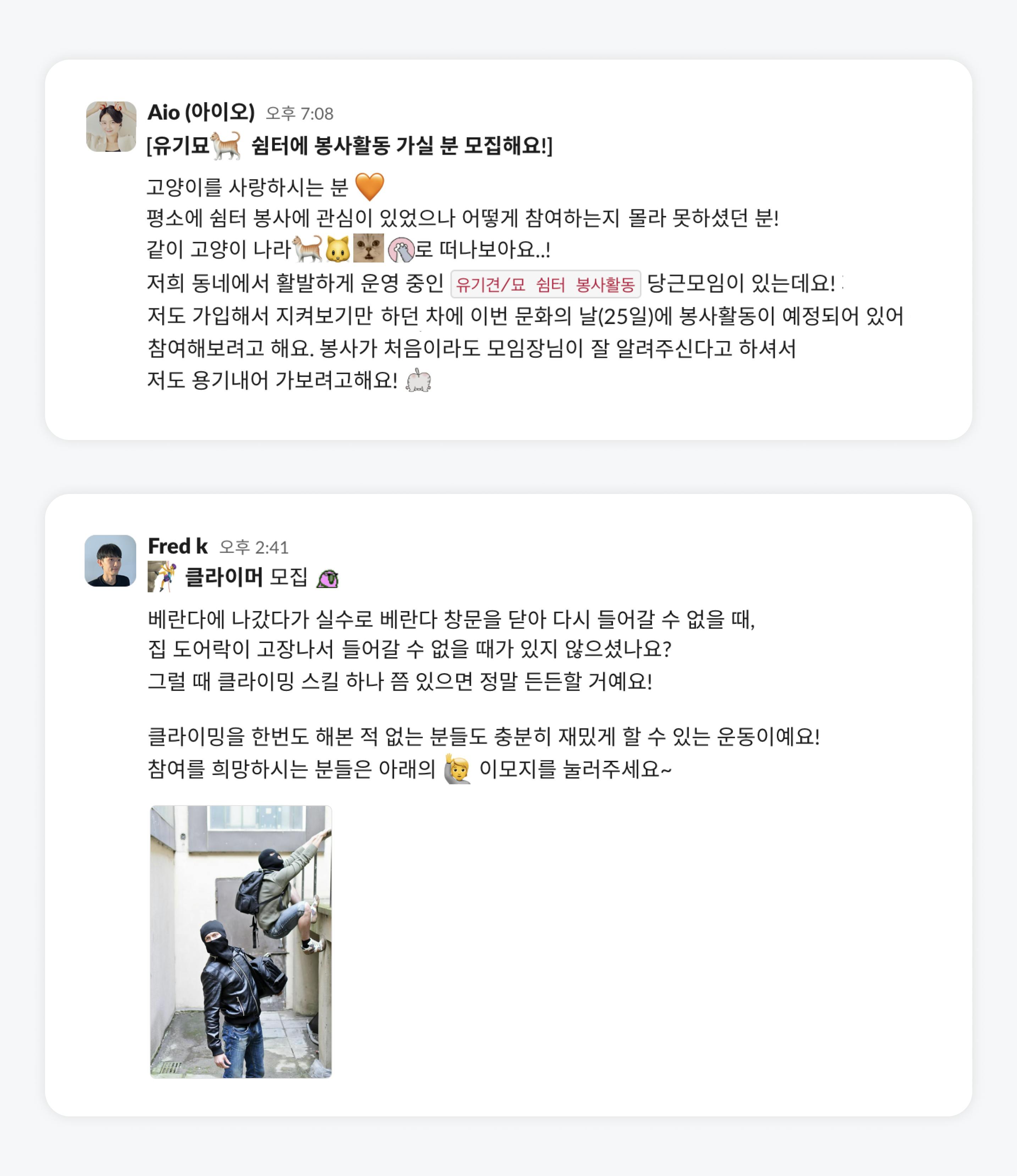 매월 마지막 주 수요일이 오기 며칠 전부터, 슬랙에 본인이 원하는 문화활동 을 함께 할 구성원을 찾는 모집 글들이 수십 개씩 올라오는데요. 활동에는 제한이 없어요. 누구든 어떤 활동이든 열 수 있고 활동비는 인당 5만 원까지 지원돼요. 활동이 끝나고 함께 식사할 수 있는 식비도 5만 원 지원하고요. 다만 어떤 활동이든 하면서 최소 2시간 정도는 대화를 나누는 시간이 있는 게 맞다고 봐요. 영화를 보거나 뮤지컬을 보더라도 활동이 끝나고 함께 이야기하는 게 중요하다고 보고 있어요.