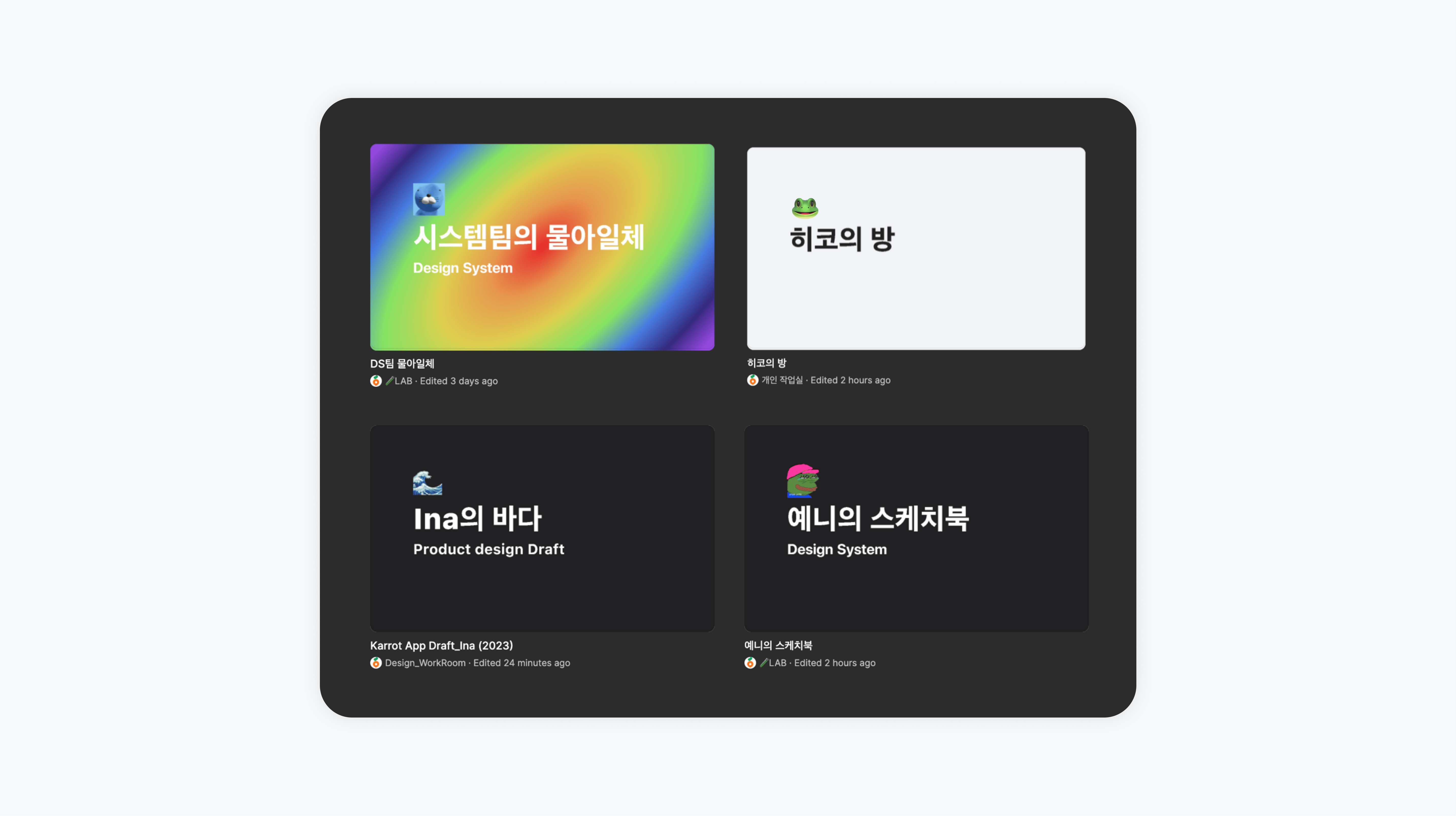 각자 Draft 페이지에는 누구의 방, 예를 들어 ‘Ina의 방’에 좋아하는 이모지를 붙여 두는데요. 그래서인지 정말 방문을 두드리고 들어와 인사를 나누는 느낌도 나요. 저는 제 아이디어가 무한대로 펼쳐지길 바라는 마음에서 페이지 제목을 ‘Ina의 바다🌊’ 로 해두었어요. (웃음)